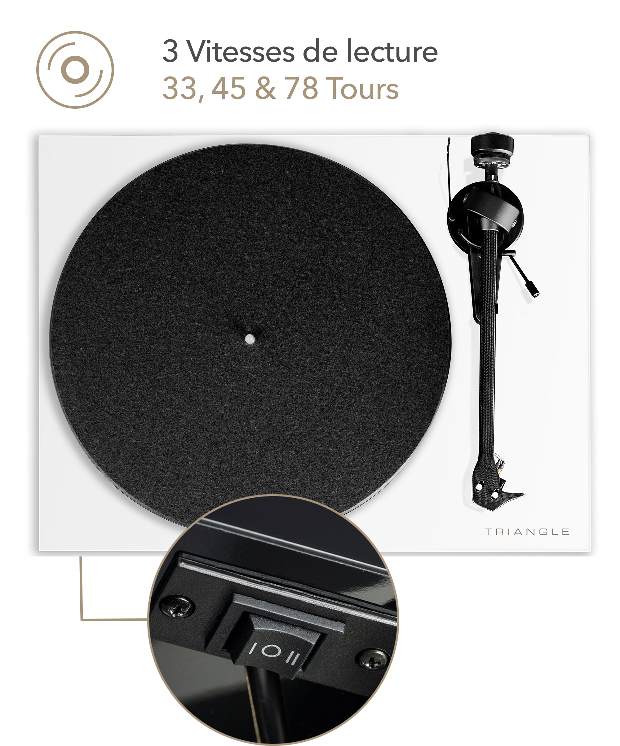 • Manueller Plattenspieler mit 33, 45 und 78 U/min (2 Riemen im Lieferumfang enthalten)