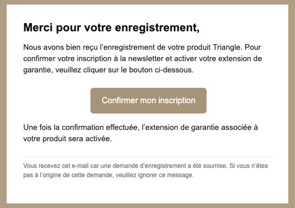 Pour confirmer votre inscription à la newsletter et activer votre extension de garantie, veuillez consulter votre boîte mail et cliquer sur le lien de confirmation :
