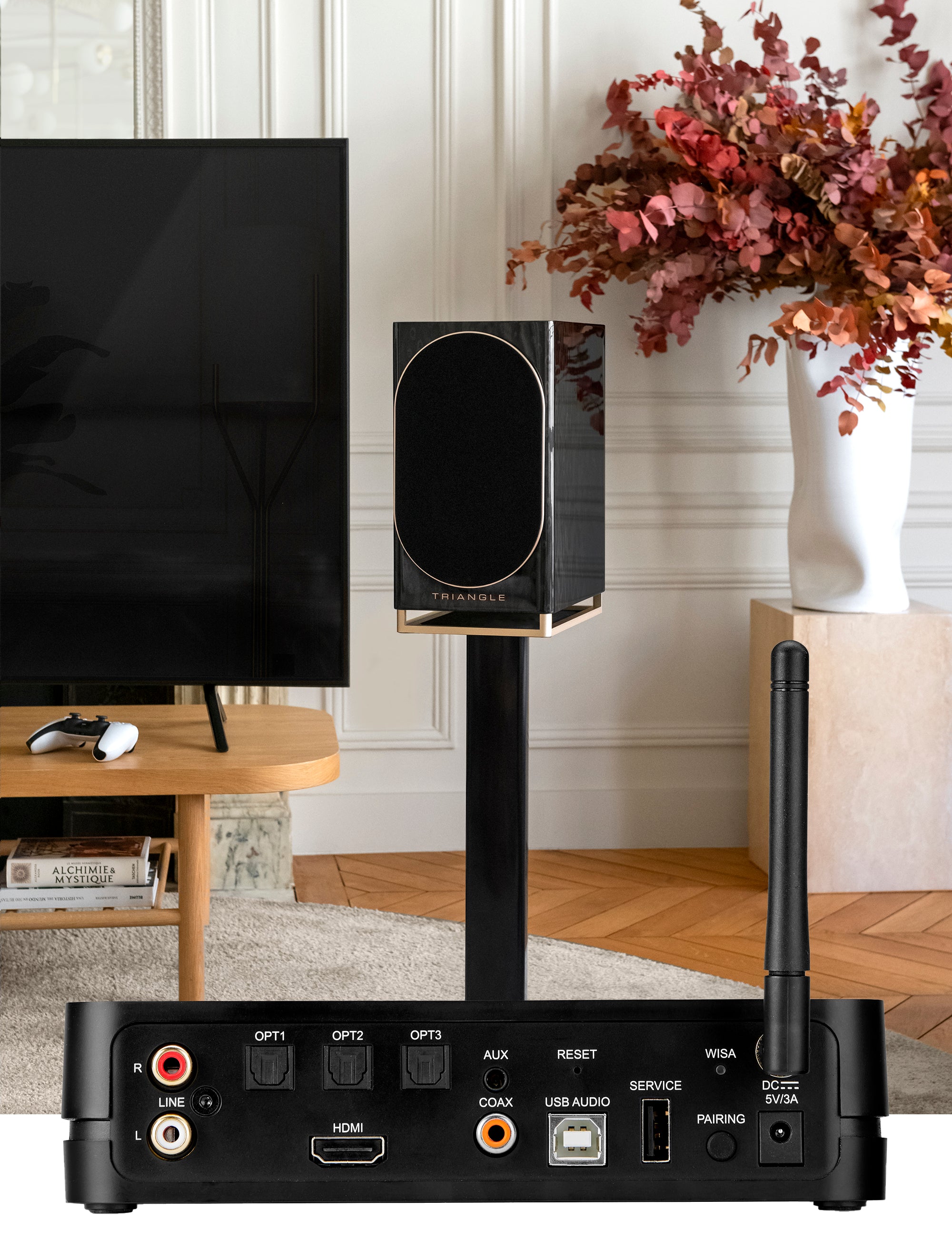 L’intégralité des sources audio, qu’elles soient issues d’un service de streaming ou reliées sur une de ses entrées, est gérée par le boitier WiSA nommé « Stéréo Hub » qui se charge ensuite de diffuser le signal vers vos enceintes en haute-résolution sans latence perceptible.